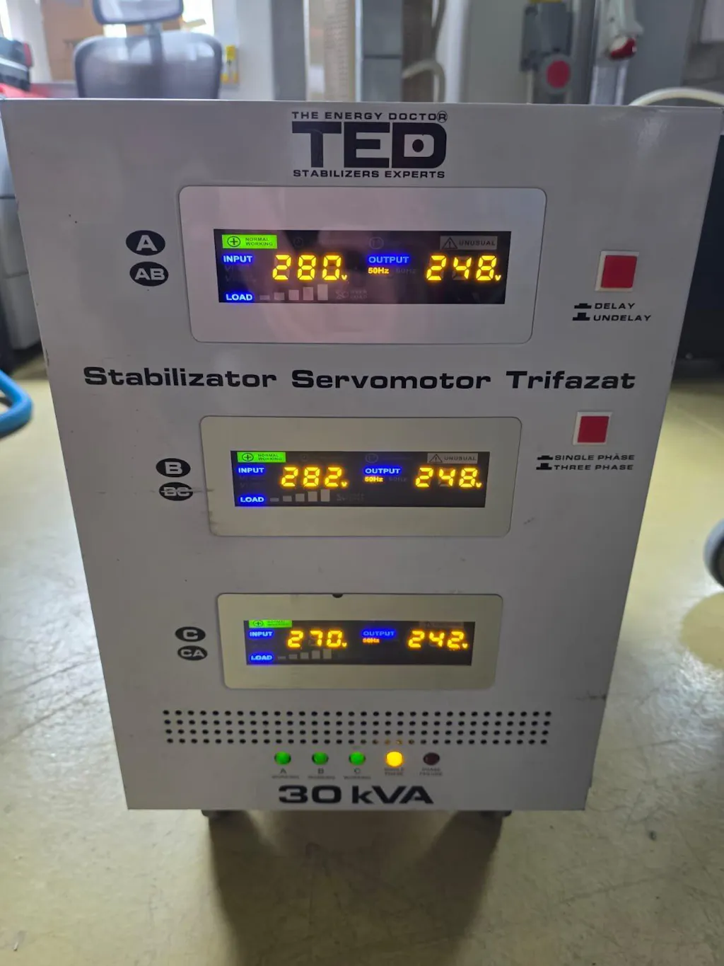 Asigurati stabilitatea retelei electrice cu noul stabilizator de tensiune trifazic 30 KVA TED Electric. Acesta elimina fluctuatiile periculoase de curent, oferind o tensiune constanta de 400V pentru protejarea echipamentelor industriale si comerciale sensibile.